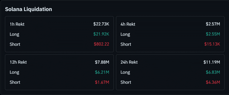 链上清算数据显示,Solana杠杆交易者多空双爆,但多头损失尤为惨重。最近4小时窗口录得约257万美元清算量,其中近255万美元为多头仓位。