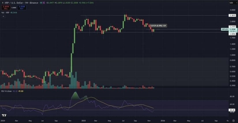 RSI已从低于2024年原始推动浪的水平反弹。历史周期(特别是2020-2021年)显示,当RSI在区间低点深度重置后,XRP往往会出现持续数月、涨幅超300%的反弹,但实际表现取决于加密市场整体状况(尤其是比特币走势)。