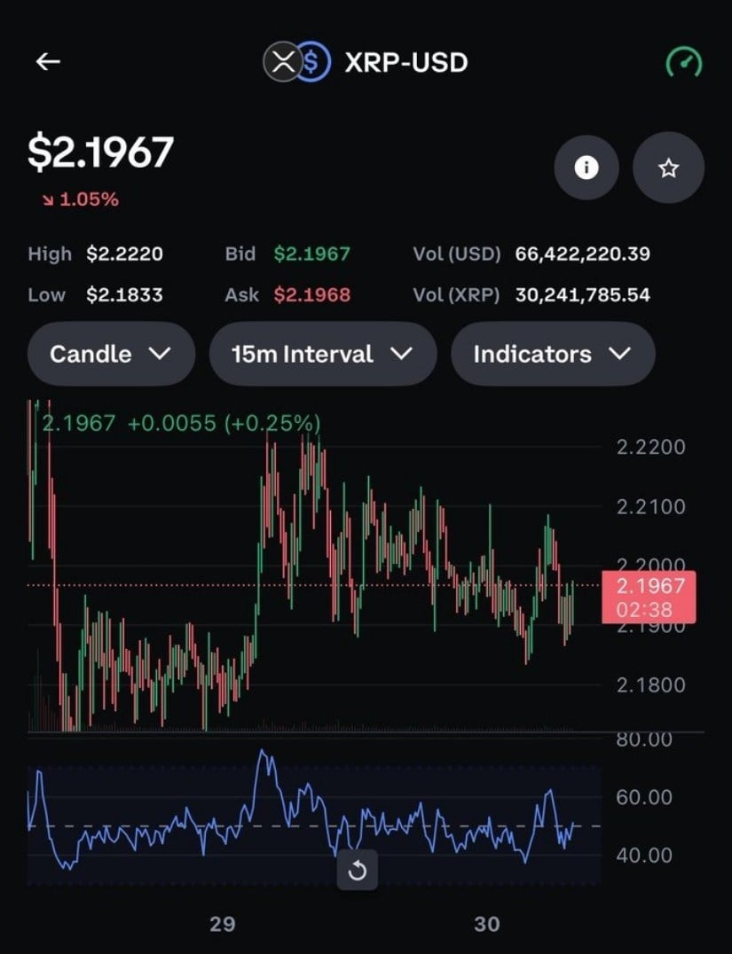 定期发布技术分析的加密货币策略师Zach Rector观察到,XRP的盘整阶段可能接近尾声。他指出XRP/USD在2.1967美元附近徘徊,日内波动区间为2.1833-2.2220美元。当前RSI稳定在60左右,暗示下行压力正在减弱。