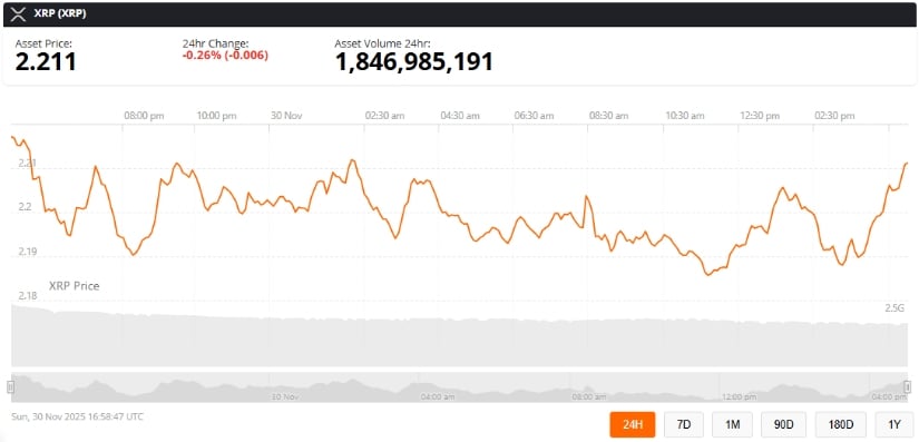 截至发稿,XRP交易价格约2.21美元,24小时跌幅0.26%。来源:Brave New Coin XRP价格