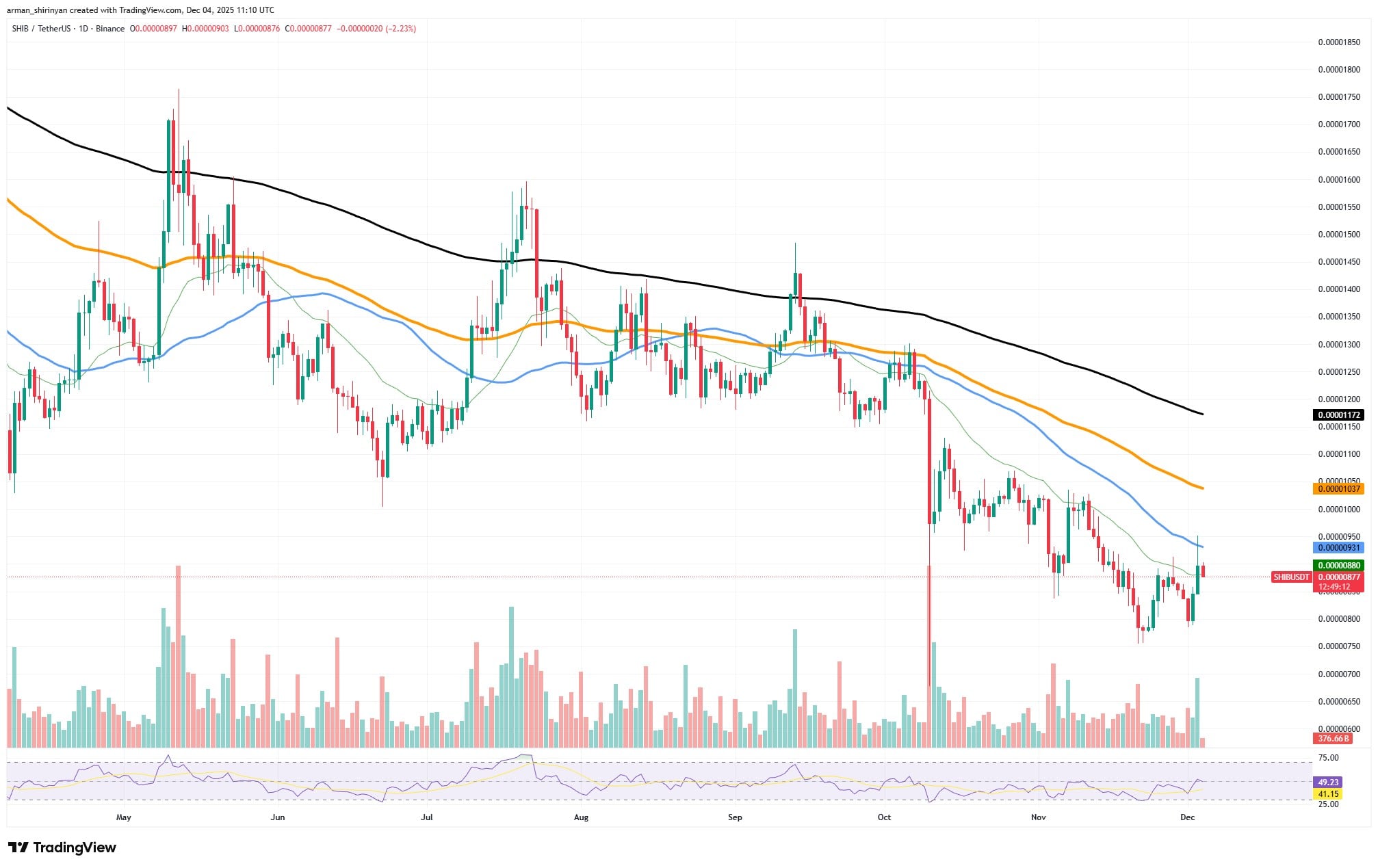 结合SHIB糟糕的价格结构,若看跌资金流持续,81万亿关键支撑位恐将失守。日线图上,SHIB价格远低于50日/100日/200日均线,且三条均线同步下行——这是典型的长期下跌信号。近期微幅反弹甚至未能触及任何阻力位,卖盘几乎立即压制了上涨。