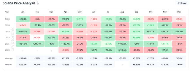 对于Solana价格而言,第四季度历来表现疲软,成为该山寨币自2020年问世以来亏损最严重的季度。这自然使得第四季度成为Solana投资者最为担忧的时期,而2025年也未能例外。过去两个月已以两位数跌幅收跌,仅剩的12月可能让Solana再次完成一个看跌季度。