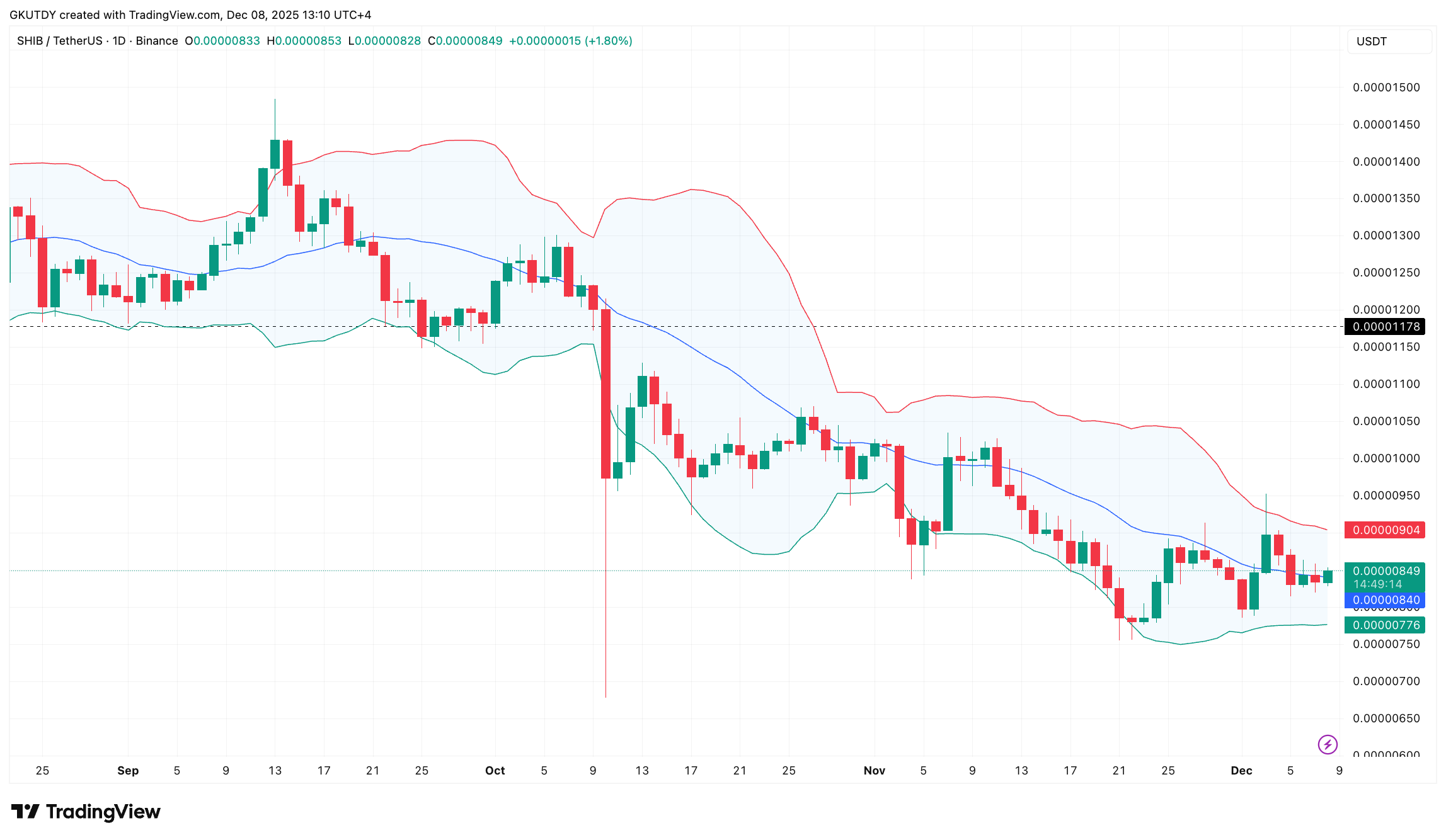 当前格局建立在0.0000084-0.00000847美元区间的强力支撑之上。即便山寨币整体市场动荡,该支撑带仍坚挺不移,为买家提供了可靠的操作基础。只要SHIB稳守该价位,下一步目标明确:测试布林带上轨——恰位于6.66%涨幅目标位。