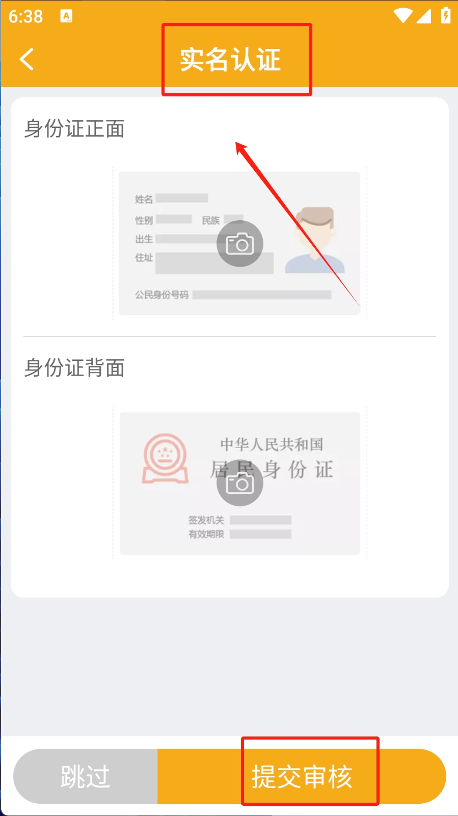 2、在实名认证页面,点击“提交审核”按钮,上传身份证正反面照片进行实名认证。