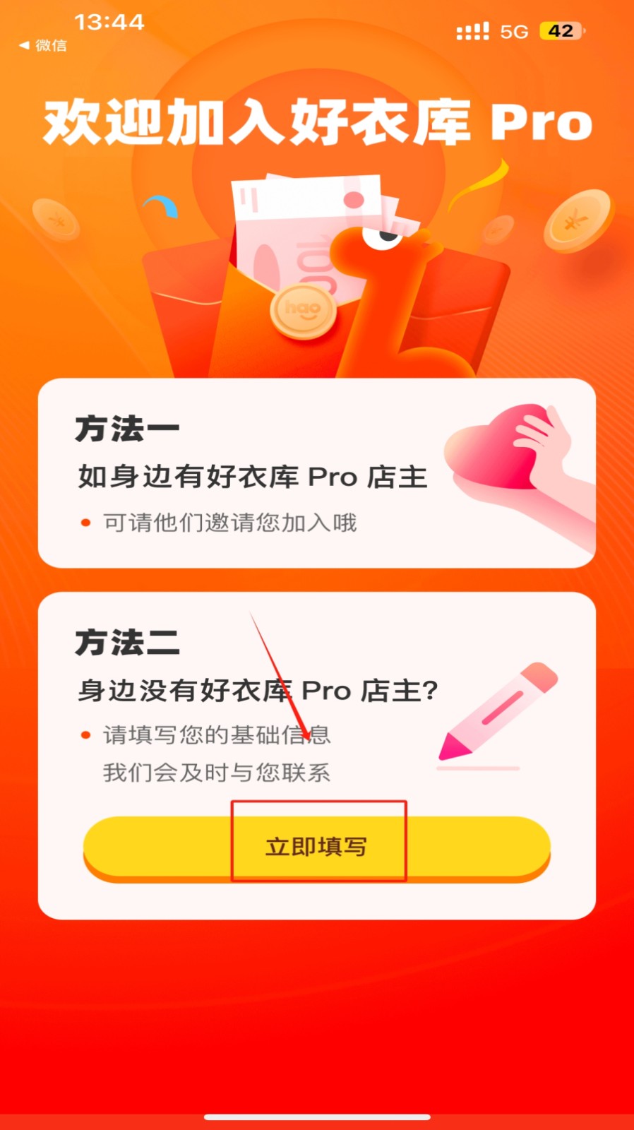 3、点击“立即填写”按钮,填写信息申请成为好衣库Pro店主。