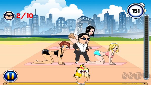 5、角色做出特定动作时,触摸屏幕发射小鸡,需在规定时间内打败角色,打中无关对象会扣时间。