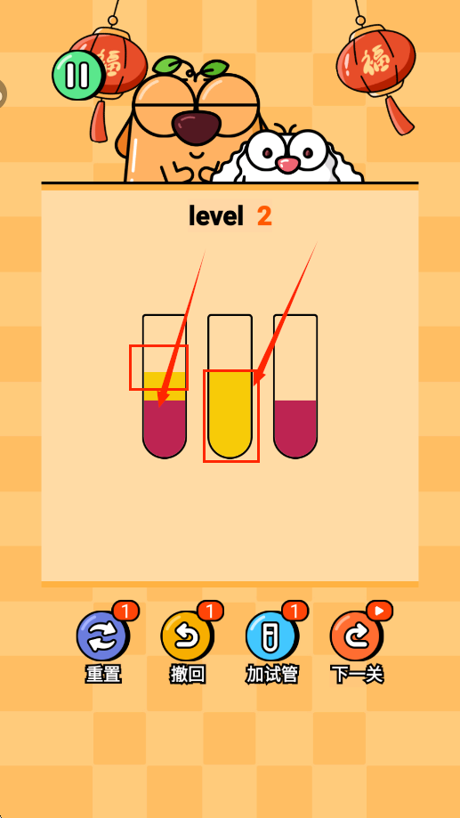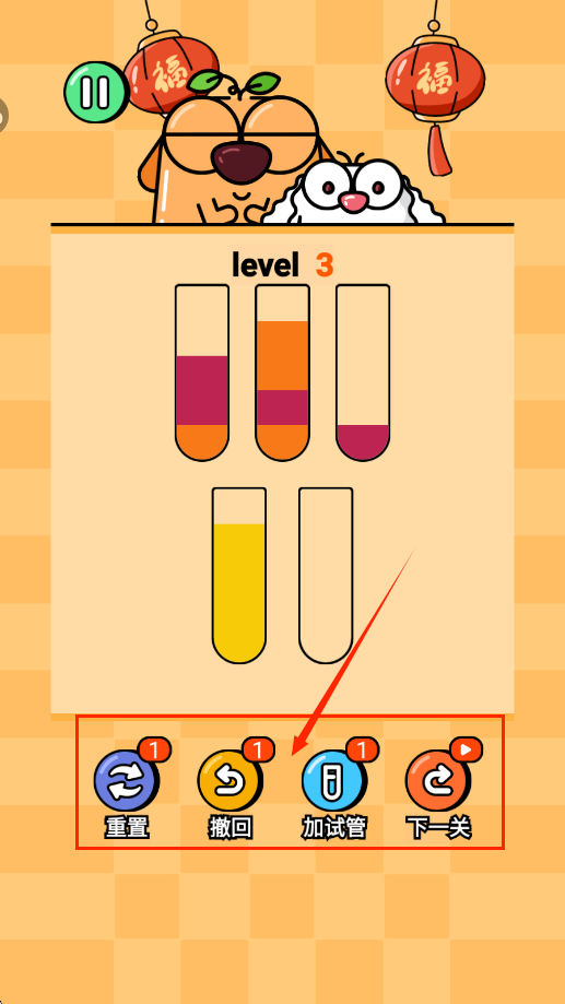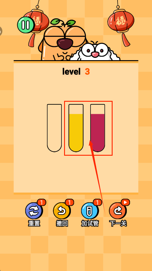 2、所有颜色都在同一个试管里面即为通关。