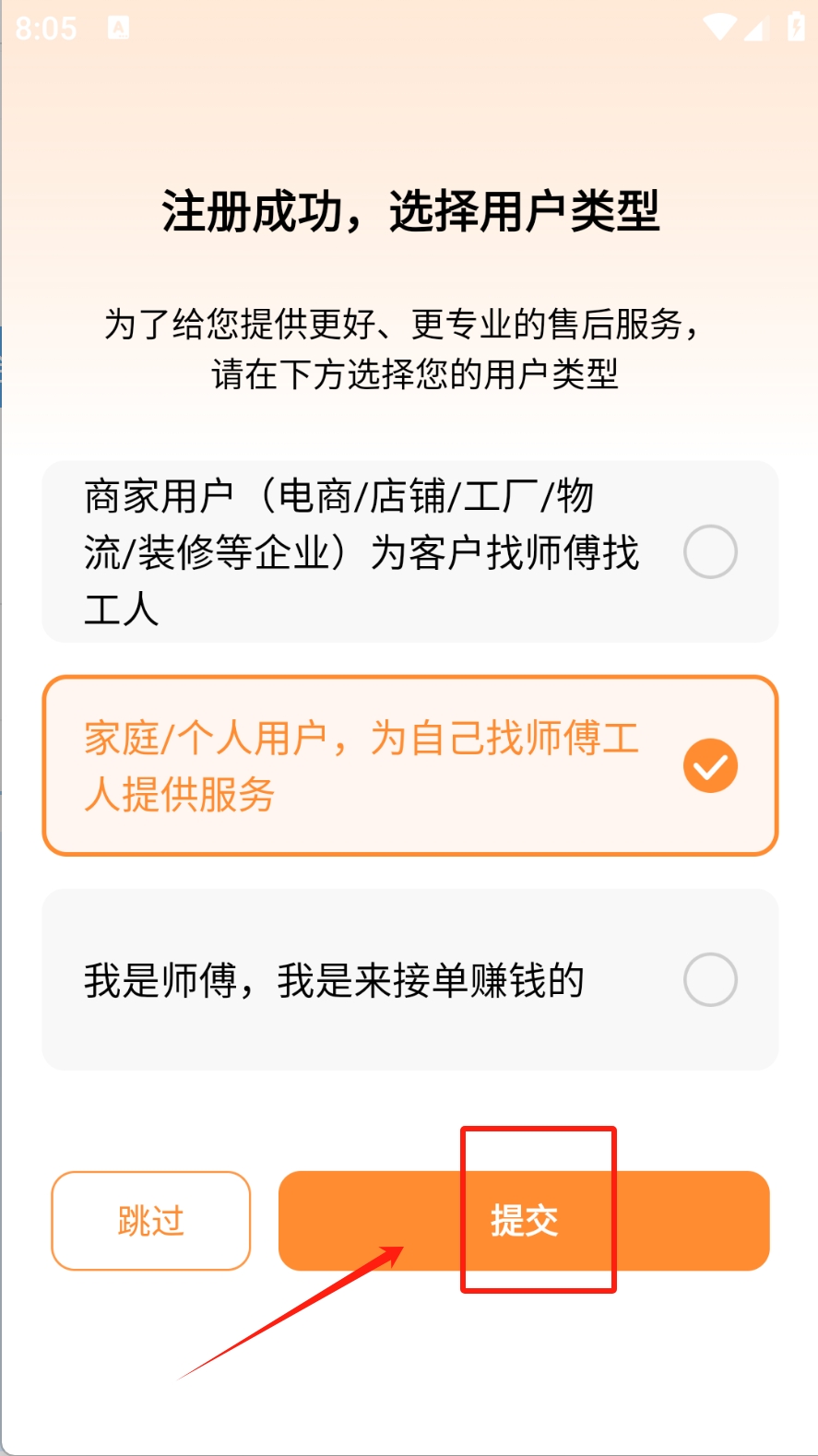 1、选择用户类型:注册成功后,选择“家庭/个人用户”类型并提交。