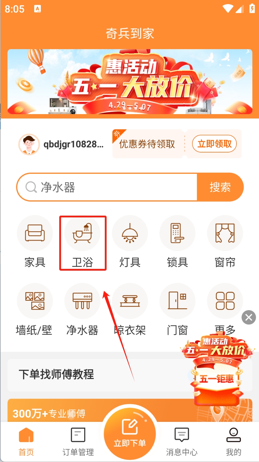 2、进入卫浴分类:在首页点击“卫浴”图标,选择所需商品。
