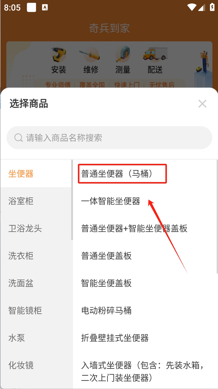 3、选择具体商品:在商品列表中,选择“普通坐便器(马桶)”。