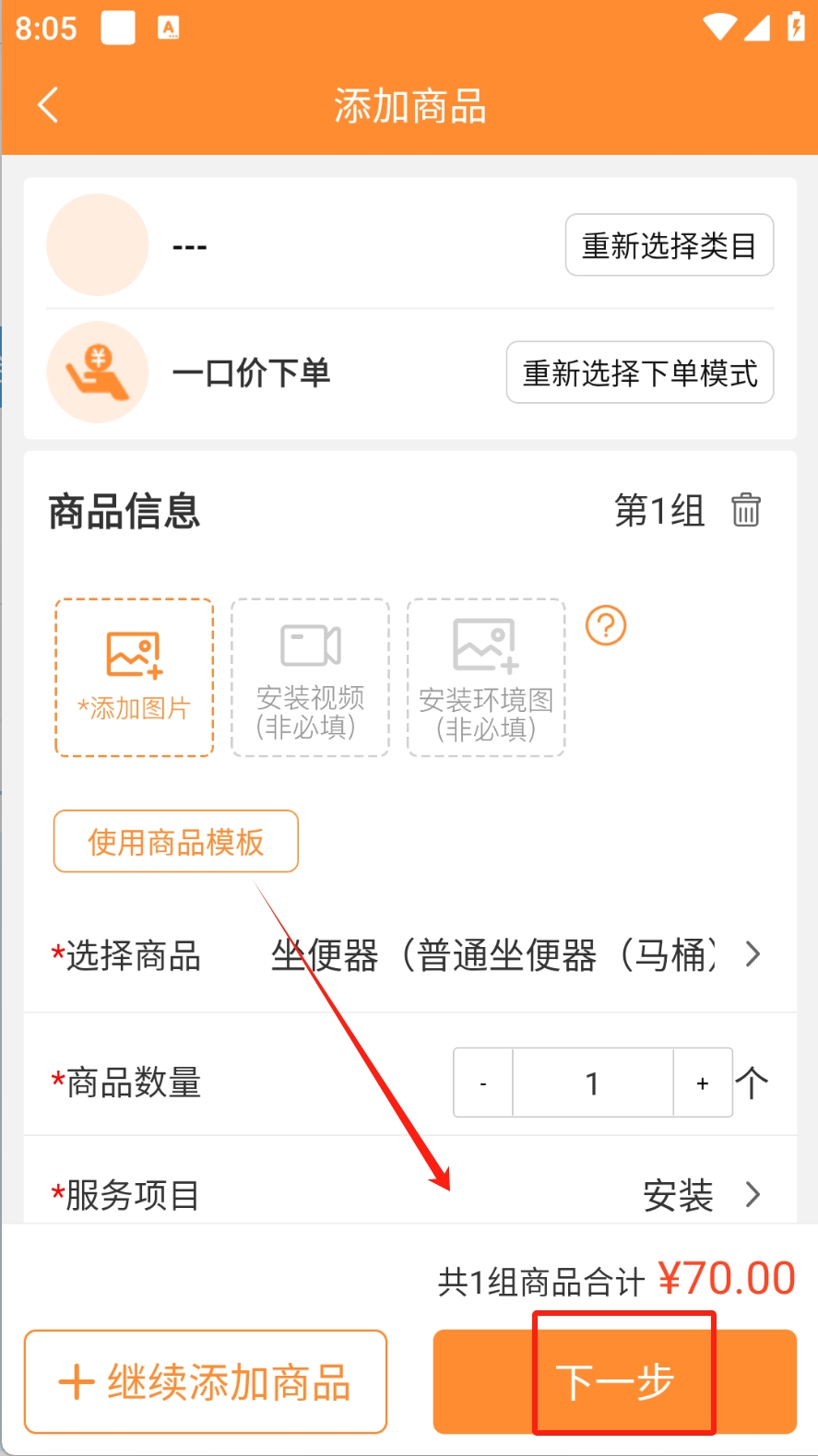 4、添加商品并选择服务:点击“下一步”,添加商品并选择安装服务。