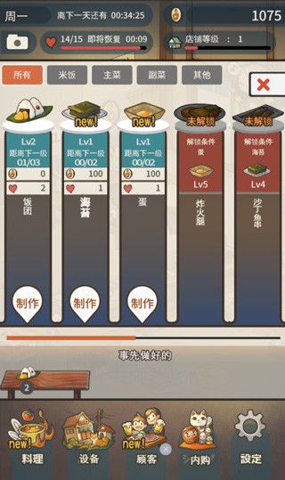 游戏初始,会有新顾客光临,游戏初始由于只有一张料理存放台,所以可以为客人们制作饭团、海苔、蛋三种中的两种。游戏的初始金币为1000,体力为15,店铺等级为1。