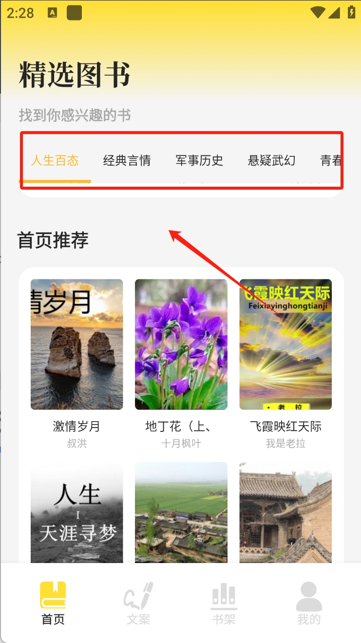 1、在首页选择感兴趣的书籍分类。