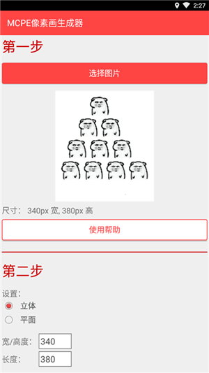 2、其次选择要立体还是平面,然后在输入宽/高度和长度,目前最大尺寸为512,请记住,一个minecraft PE的世界高度是为128块方块所以在选择立体生成的时候宽/高度不能够超过128,然后在设置好像素画的层数目前最大层数为16层。建议尺寸最大不要超过300,层数最多选择6层,因为尺寸和层数越大生成的时间就越久。