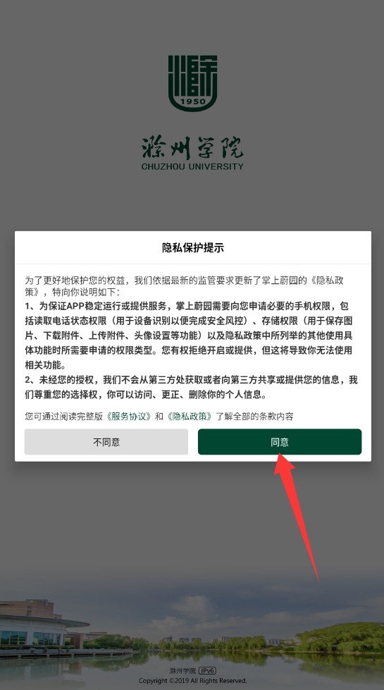 1、首次启动应用时会显示隐私协议条款,仔细阅读后点击"同意并继续"按钮方可进入登录界面。
