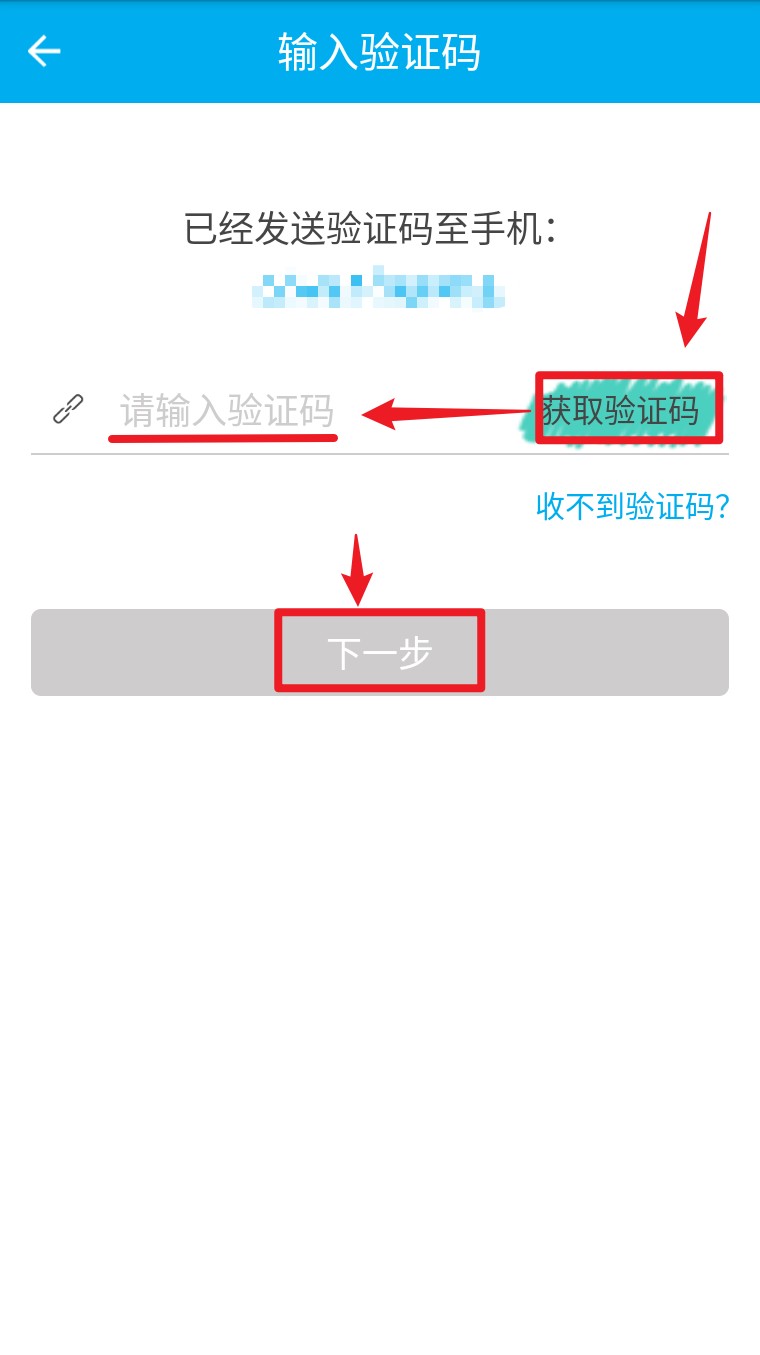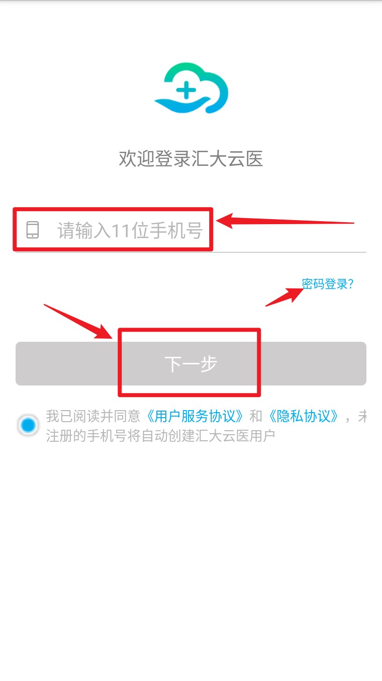 1. 打开汇大云医 App,输入 11 位手机号,点击“下一步”进入验证码页面完成登录操作。