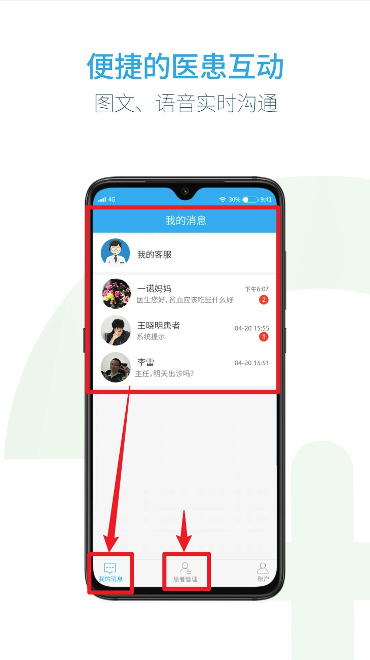 3. 登录后点击底部“我的消息”,可查看系统提示或与医生进行图文语音在线沟通。