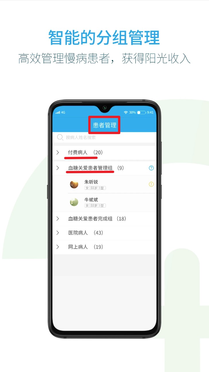 4. 进入“患者管理”页面,点击不同标签分组,高效整理慢病患者信息并随时查看。