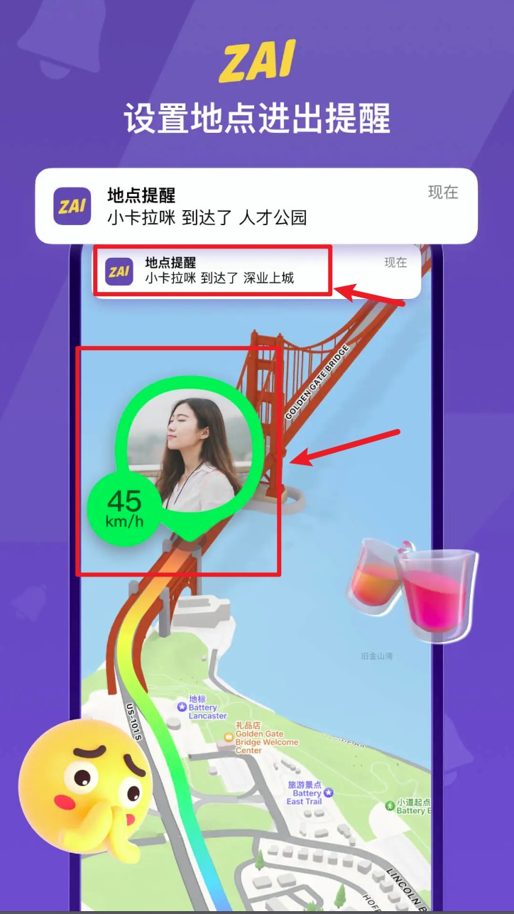 3. 设置地点提醒功能,选择好友并添加提醒点,当对方进出时会自动收到通知。