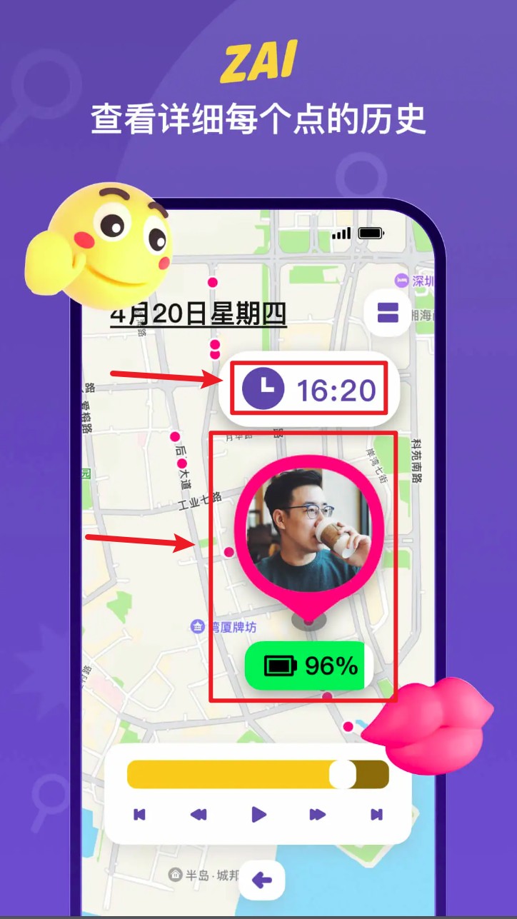 5. 点击底部的历史时间轴,可回顾好友的每日路径轨迹与停留记录。