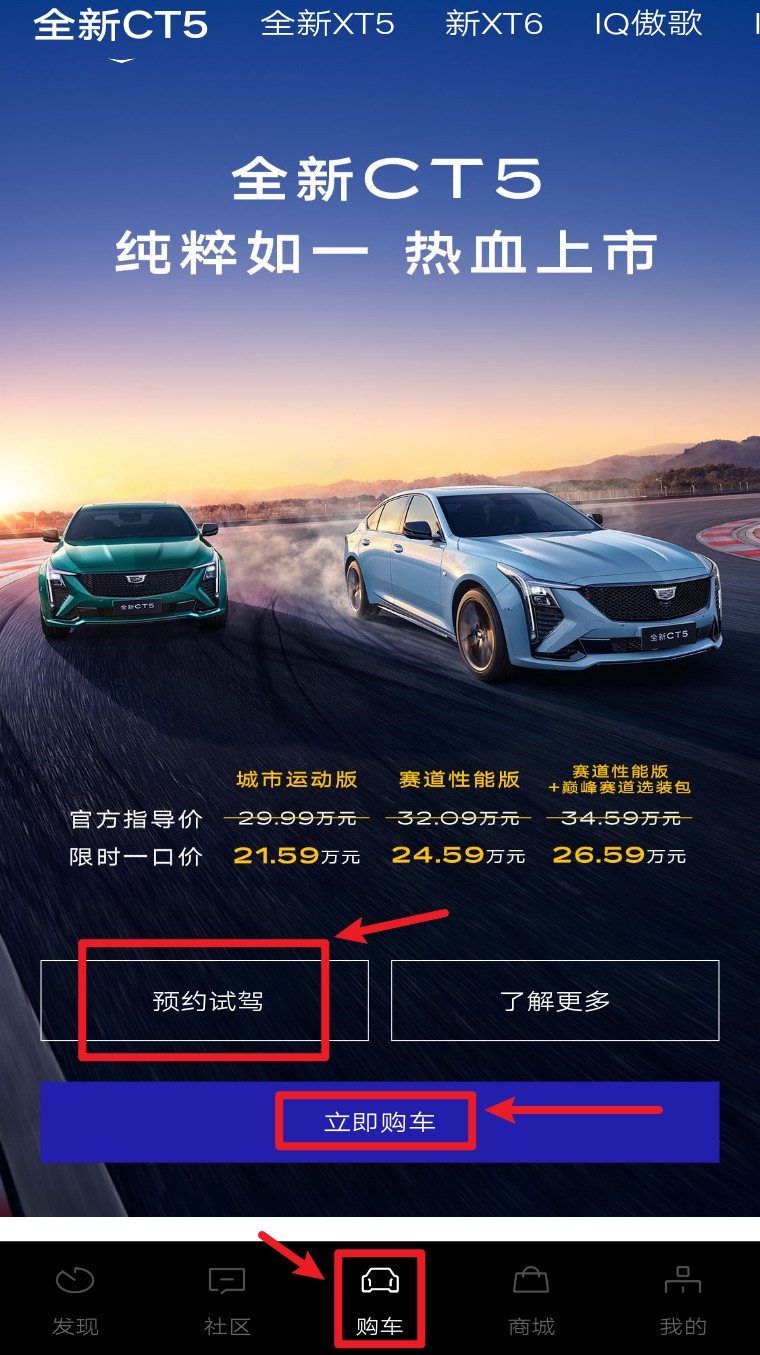2. 登录后切换到底部菜单“购车”,选择欲购车型,可点击“预约试驾”或“立即购买”进行操作。