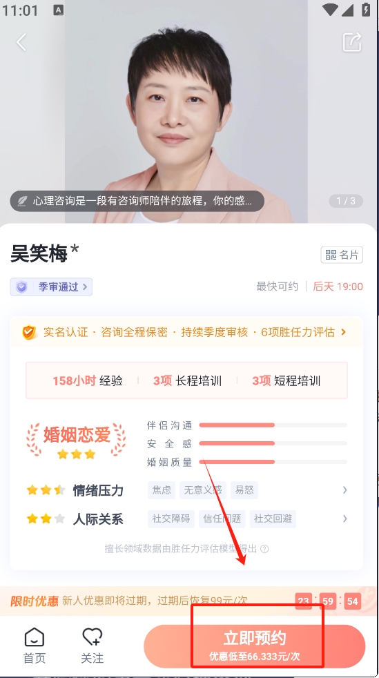3、选择感兴趣的咨询师并点击“预约Ta”按钮进行预约。