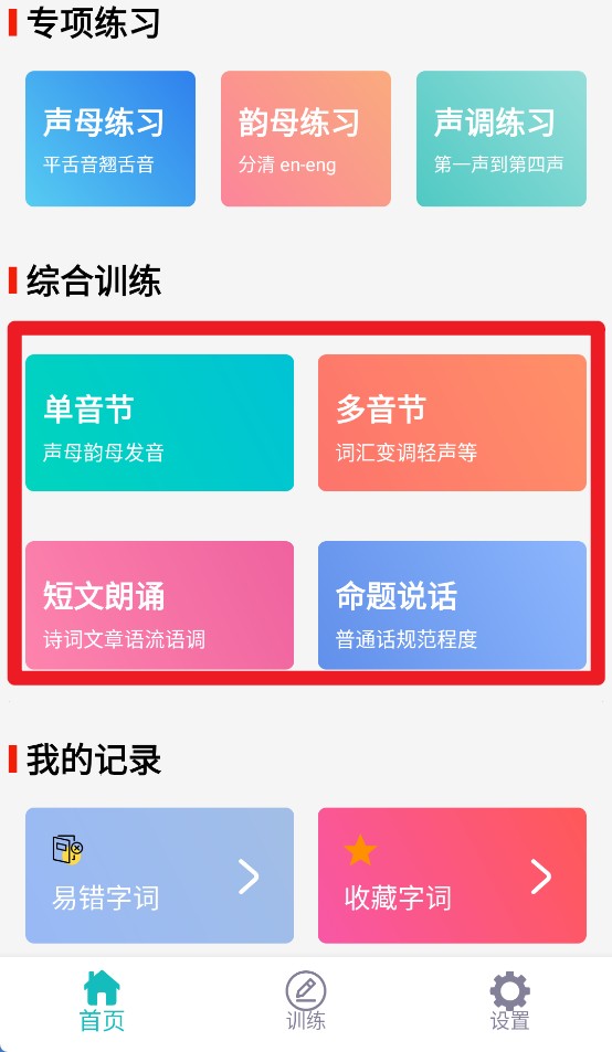 1、发音练习:选择声母、韵母或声调,开始跟读并获取评分。