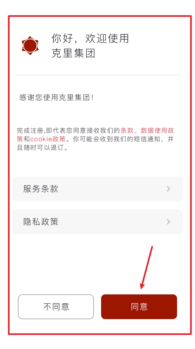 1. 初次进入 App,请阅读并同意服务条款及隐私政策,点击“同意”完成确认。