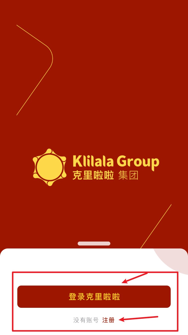 2. 在欢迎页面选择“登录克里啦啦”,已有账号可直接登录,无账号可点击“注册”。