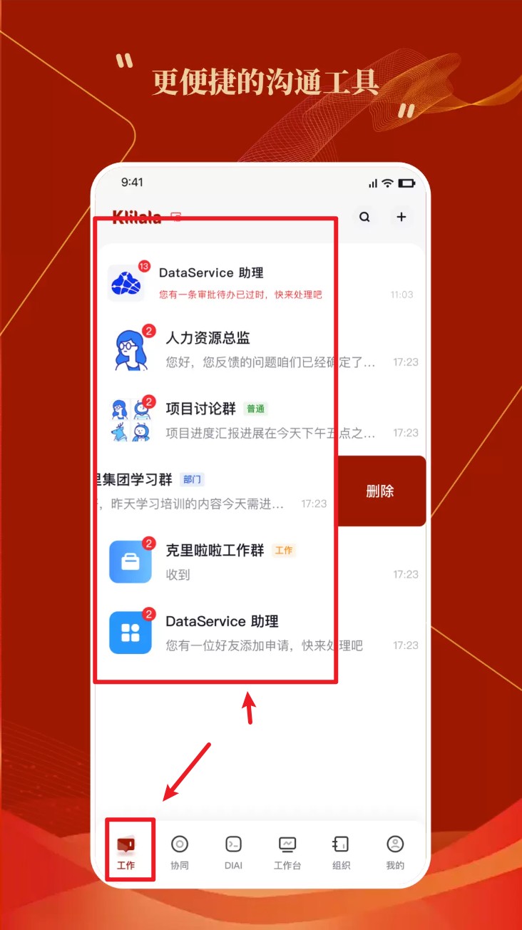 4. 点击底部“工作”进入消息中心,查看项目群组消息与系统通知并及时处理。