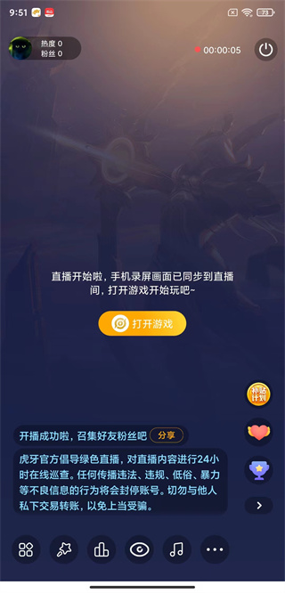 4. 开始直播:点击“一键直播”,按照指引开始分享你的游戏时光。