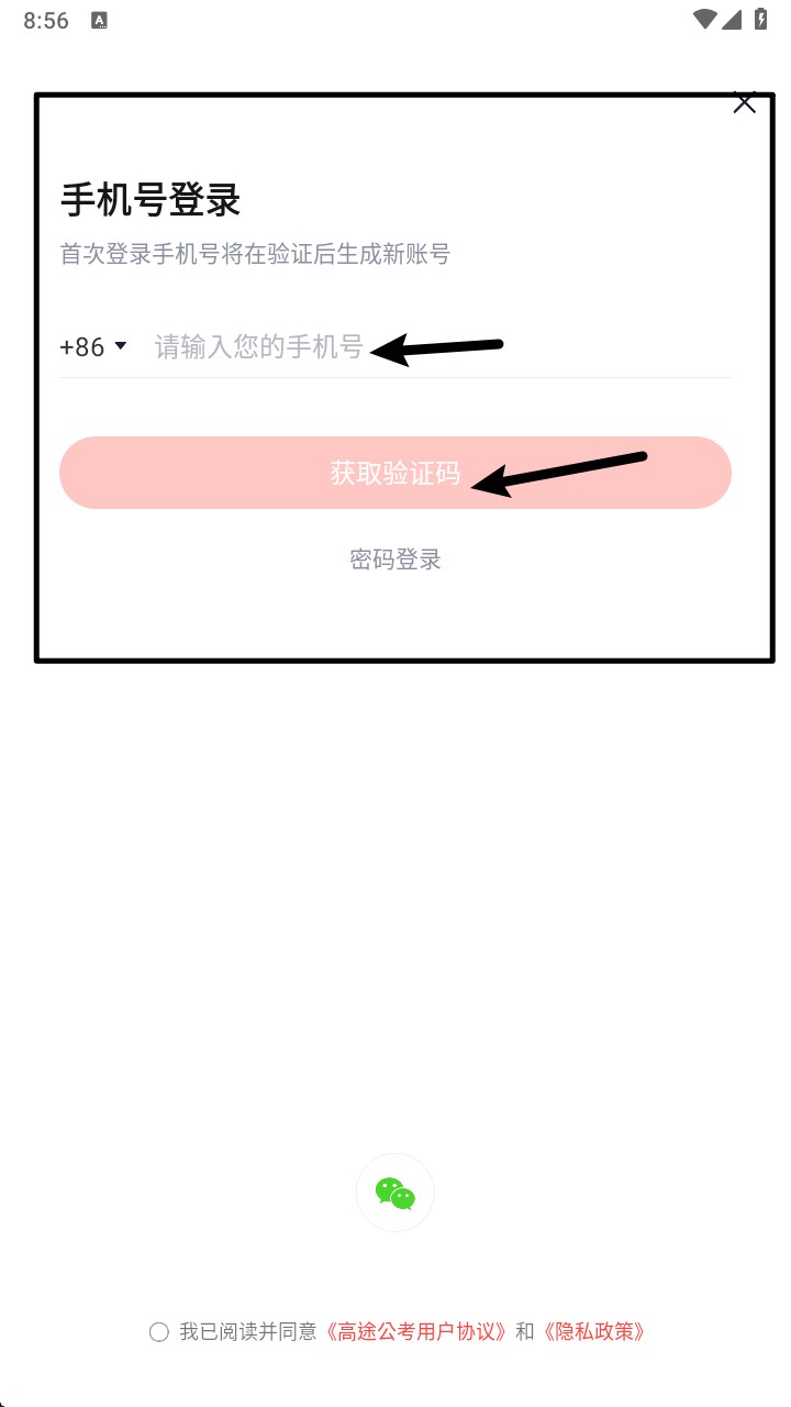 1. 打开 App 后进入“手机号登录”页面,输入手机号并点击“获取验证码”完成注册或登录。