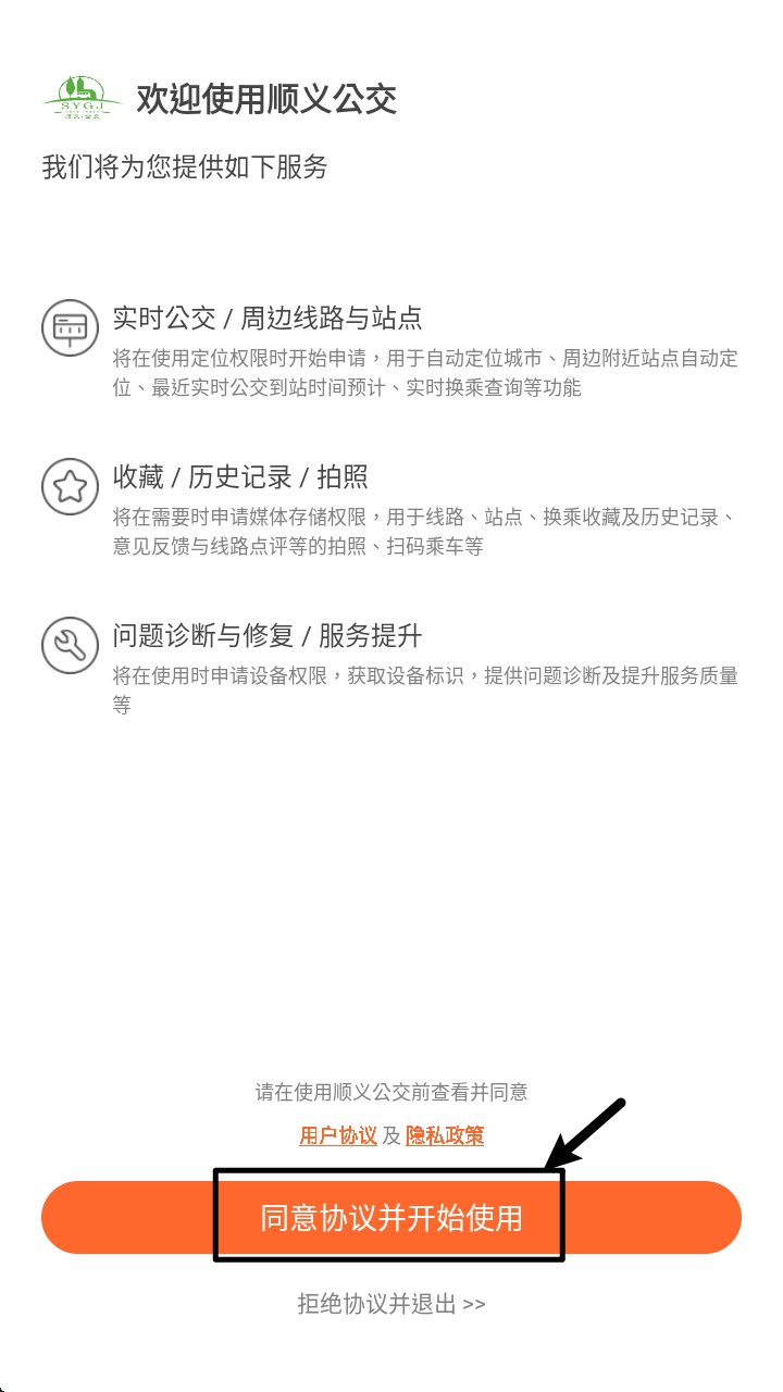 1. 打开 App 后,点击“同意协议并开始使用”按钮以完成初始权限授权流程,进入主界面。