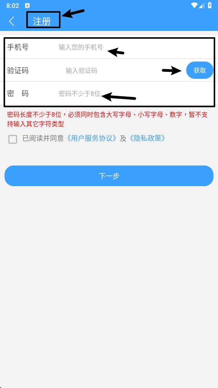 2. 点击「注册」进入页面,输入手机号码、验证码及密码,勾选协议后点击「下一步」完成注册。
