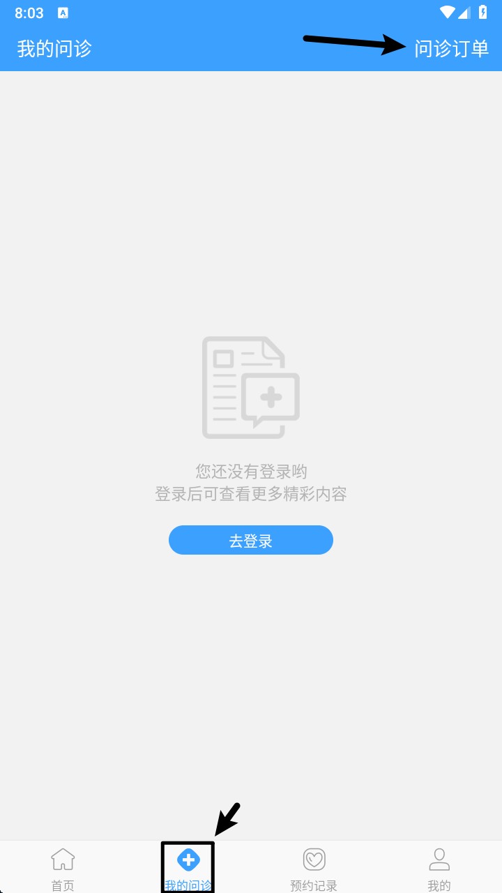4. 点击底部菜单栏中的「我的问诊」,可查看历史问诊订单及详细记录,便于后续管理。