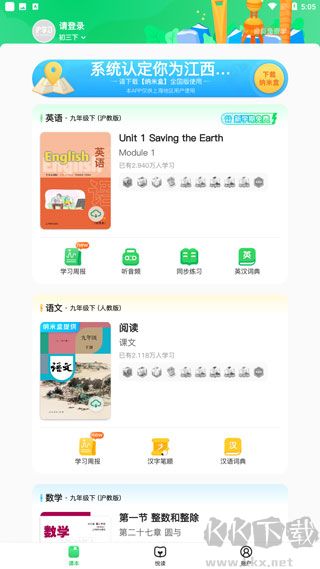 1-9年级全科电子教材,支持智能点读、原文朗读、分段复读、口语评测、同步练习等功能,课前预习课后复习全覆盖。