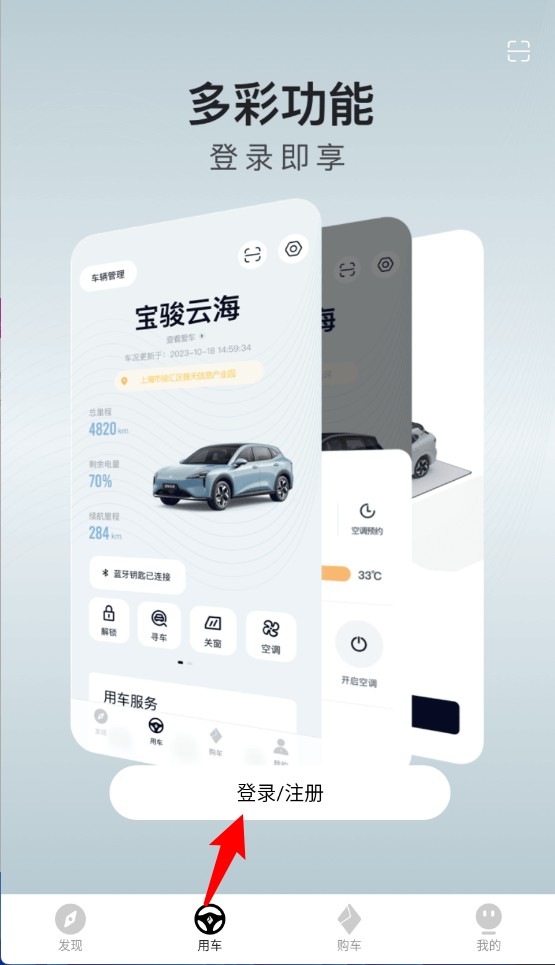 2、点击“用车”进入宝骏云海服务,登录后可享多彩功能服务。