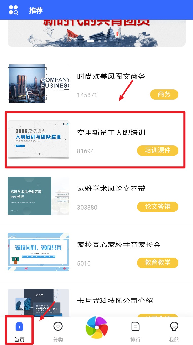 3. 登录成功后返回首页,浏览推荐模板内容,点击任意模板可进入详细页面。