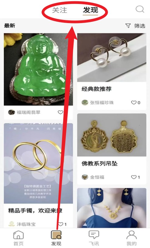 1、点击底部“发现”栏目,即可浏览推荐珠宝商品内容。