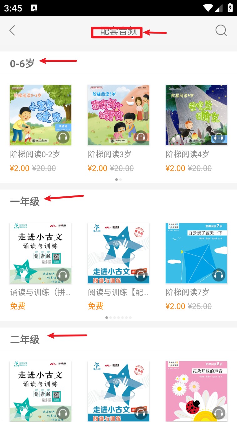 2. 点击“配套音频”进入资源页面,根据年龄段或年级查找适合的音频内容进行学习。
