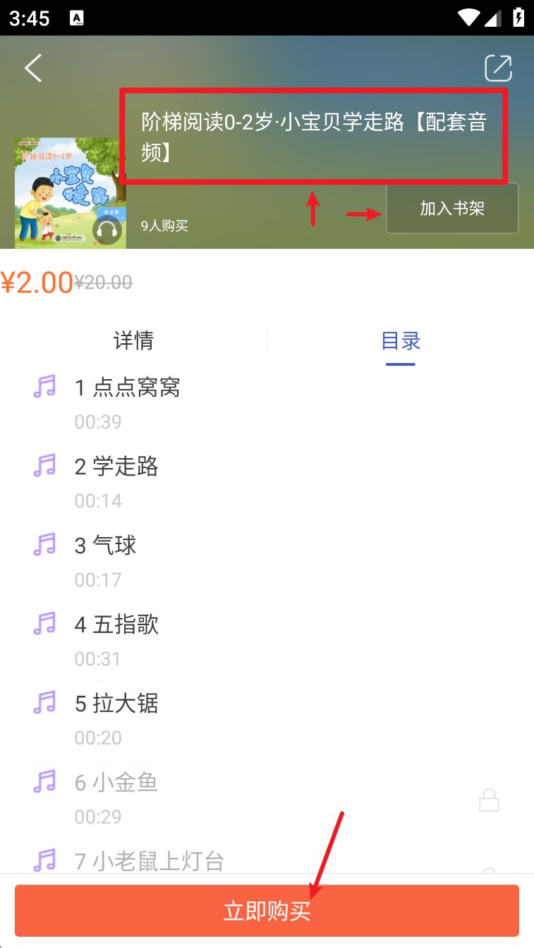 3. 选择对应书籍后,可查看音频目录并点击“立即购买”完成购买,或加入书架以便日后使用。