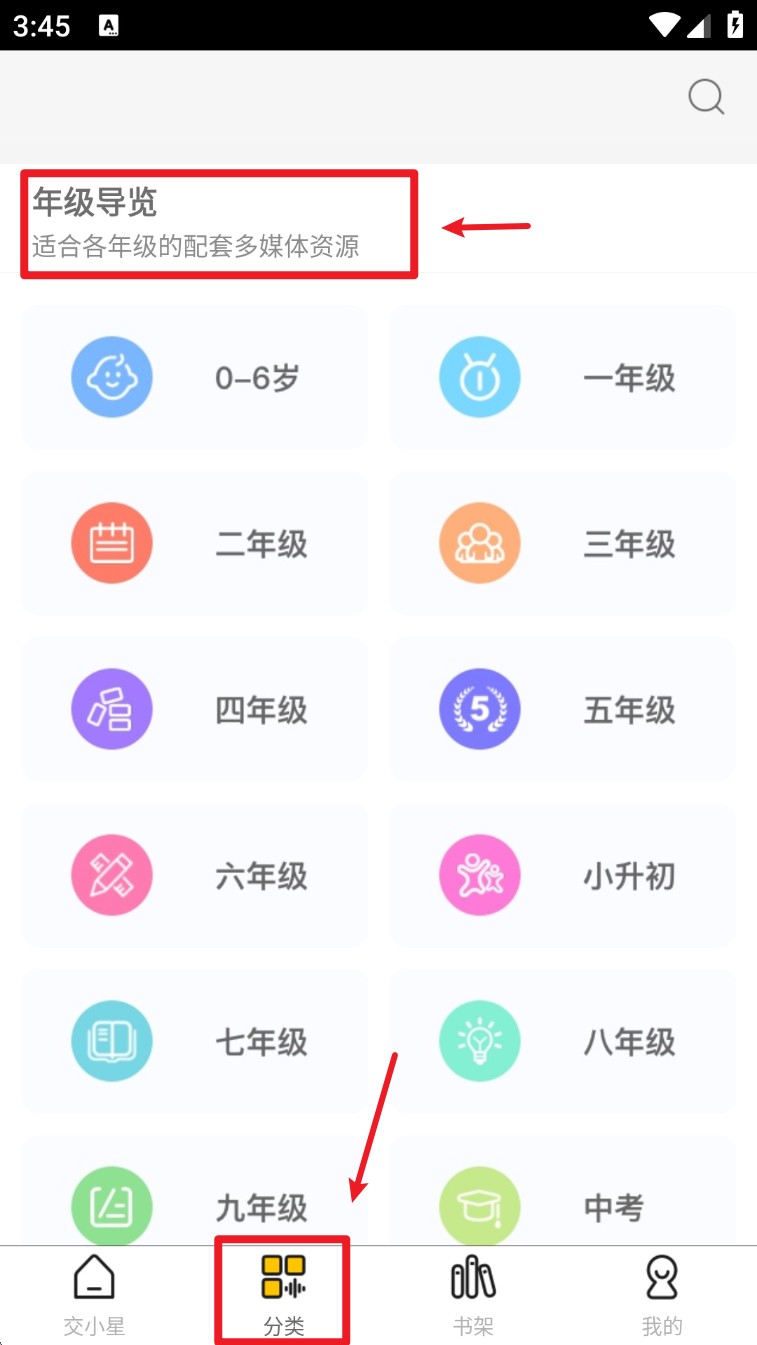 4. 在下方点击“分类”可根据年级导航快速切换资源,覆盖从学前到初中的学习阶段。