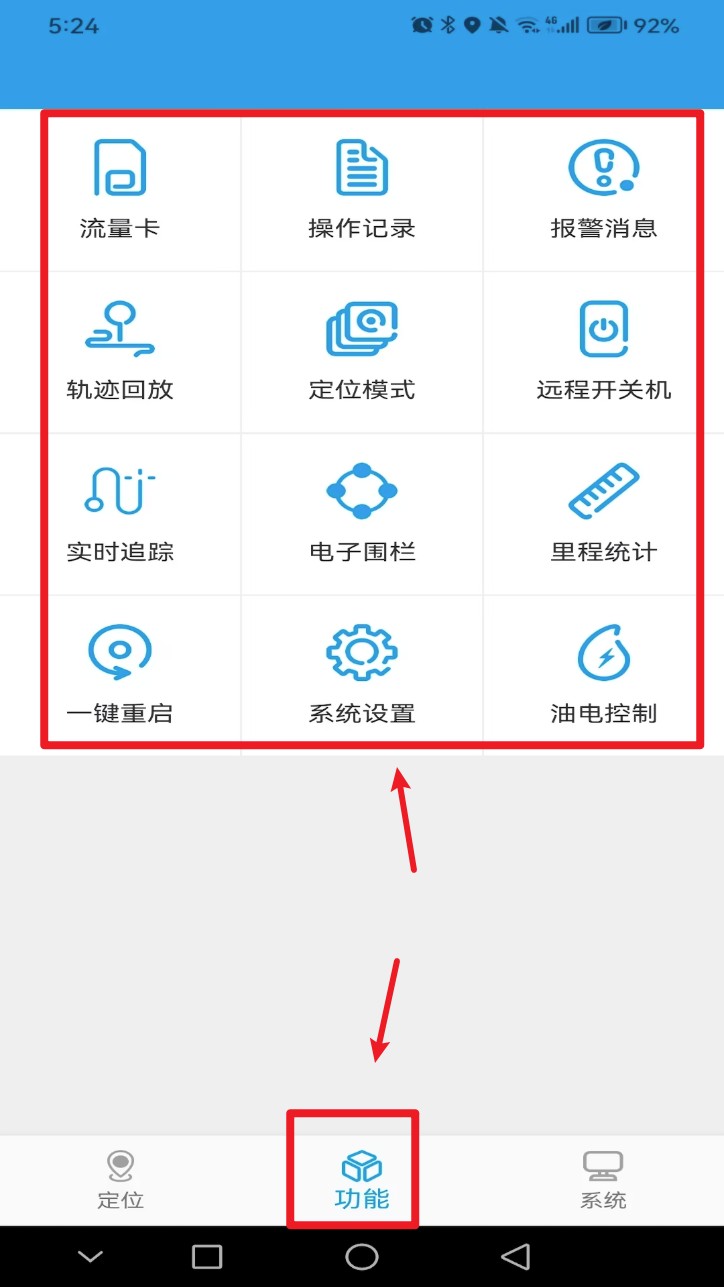 4. 切换至“功能”页签,可使用远程开关机、电子围栏、实时追踪等车辆管理功能。