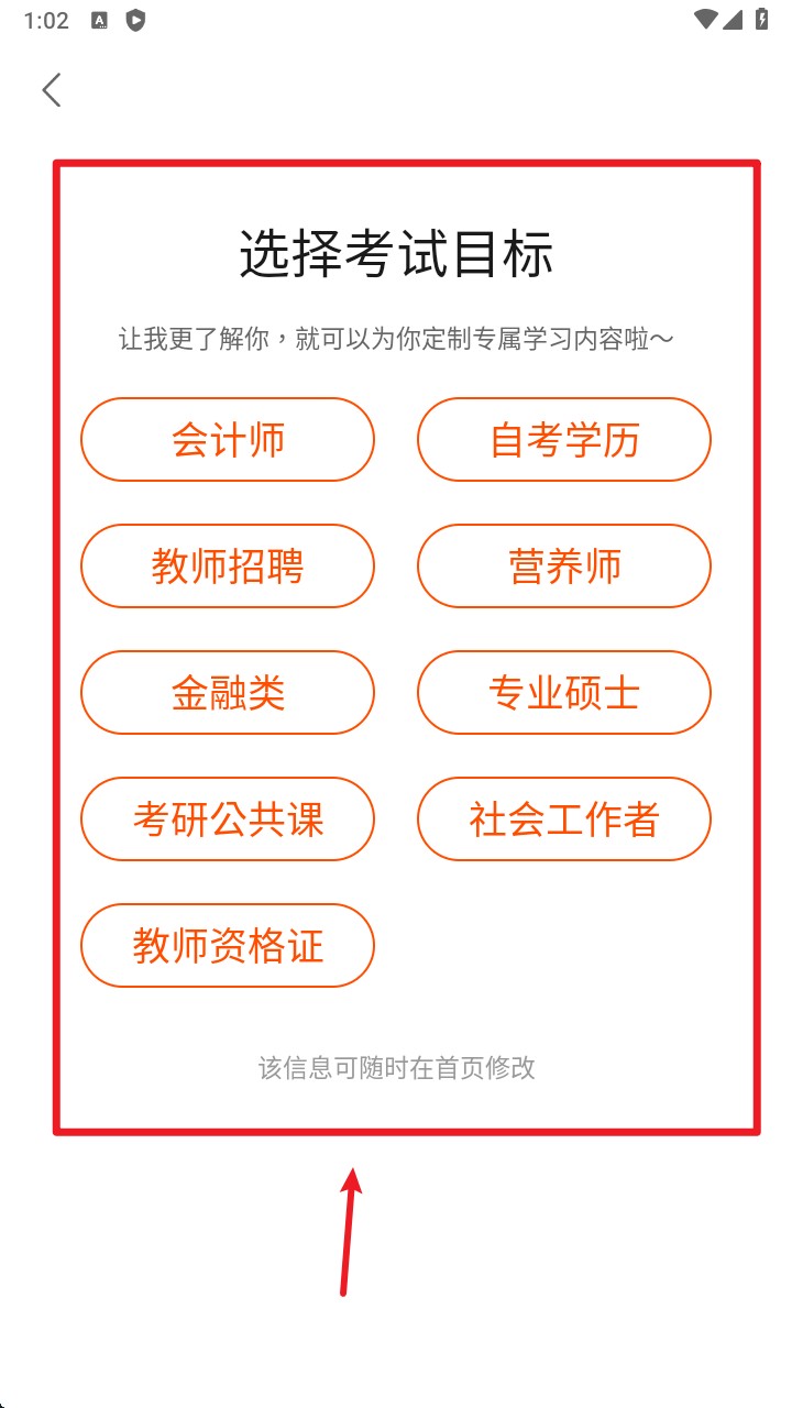 2. 系统将提示选择考试目标,如会计师、自考学历、教师招聘等,点击对应目标即可。