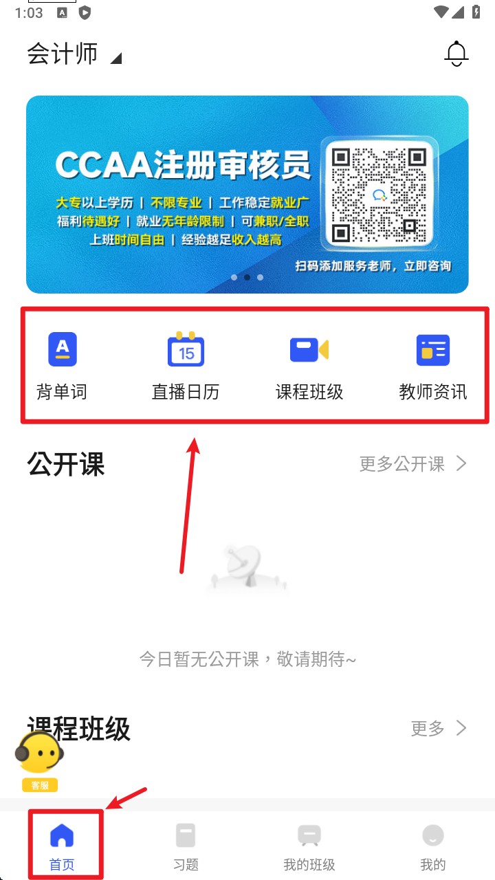 3. 进入首页后可查看“背单词”“直播日历”“课程班级”等功能模块,支持随时切换。