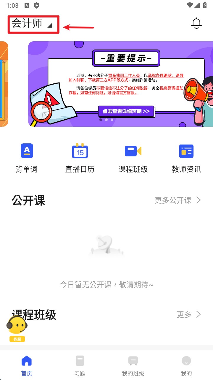 5. 目标切换后,首页内容会同步刷新,推荐适配的新课程、资讯与题库内容。