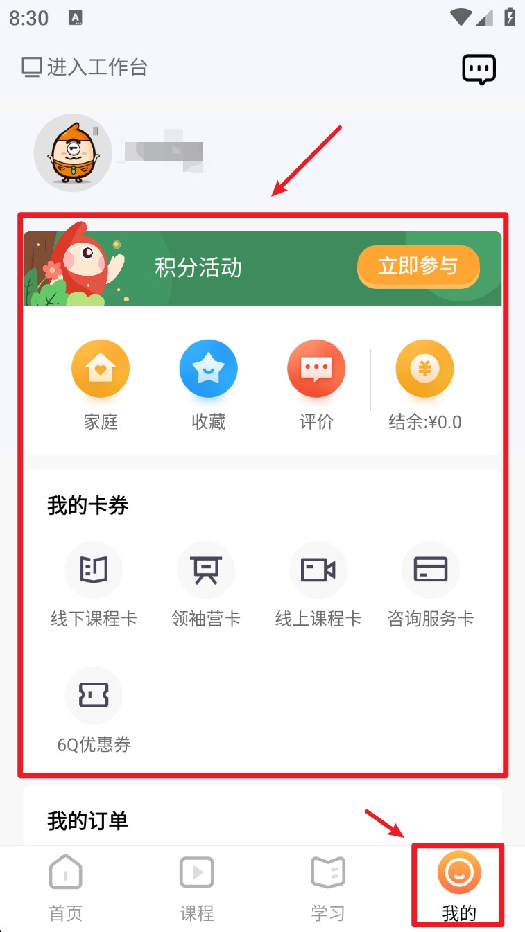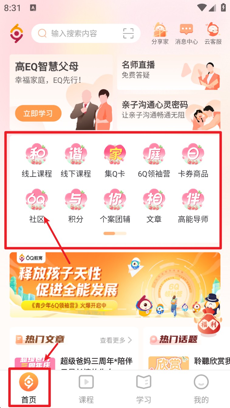 3. 点击左下角“首页”进入主界面,可浏览热门课程、进入6Q社区或使用集Q卡功能。