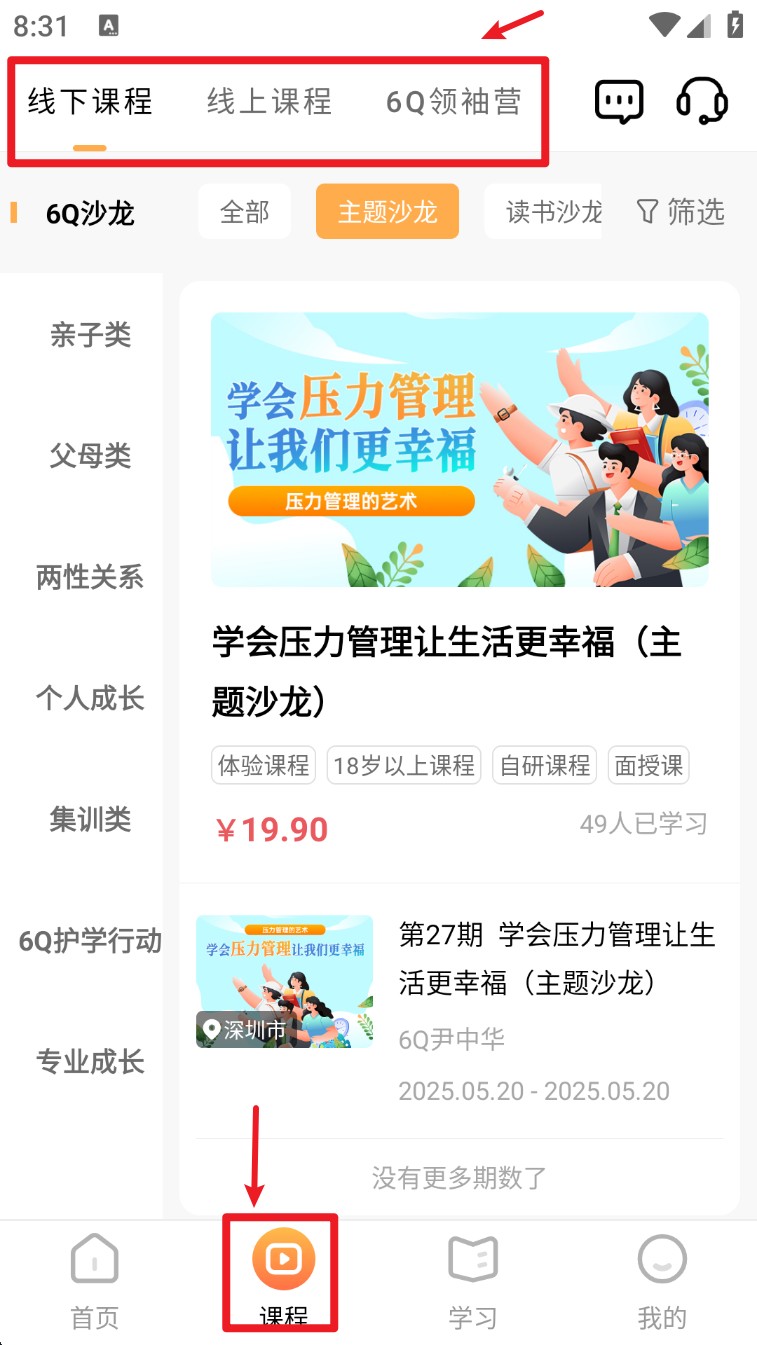 4. 切换至“课程”页面,浏览线上与线下课程,支持按主题分类查看与付费报名。