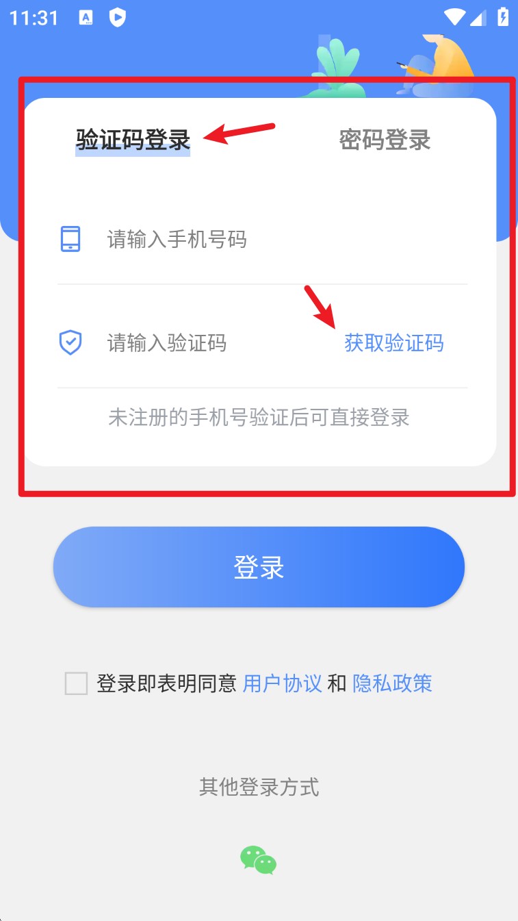 1. 打开 App 后默认显示验证码登录界面,输入手机号并点击“获取验证码”以完成快速登录。
