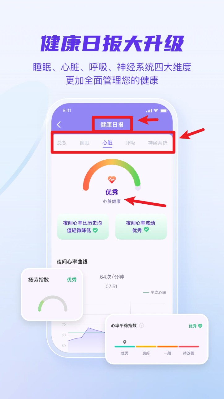 4. 登录成功后,在首页点击“健康日报”可查看每日健康情况,涵盖睡眠、心脏、呼吸等多个维度。